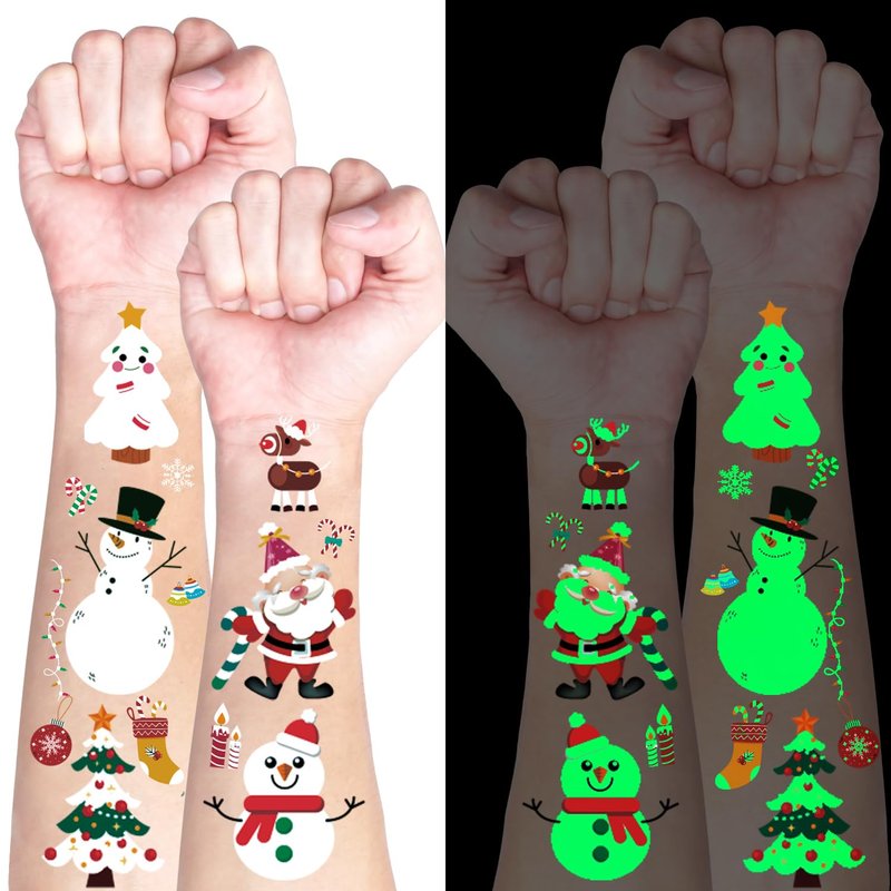 - 【Simple to Use and Remove】Choose a pattern you like, and then face down on skin, wet the temp tattoo with water and wait for 10 seconds. Then gently tear off the white surface. You will get a glow Christmas tattoo! Luminous tattoos need to be activated under light for a few minutes, which can make them more luminous in the dark.