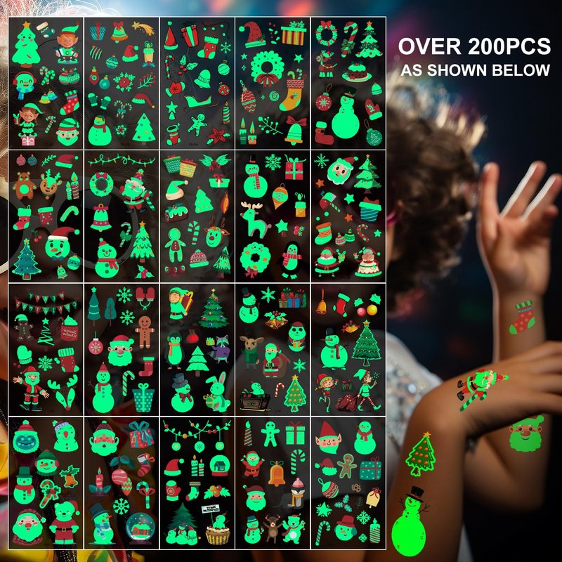 - 【Luminous Tattoos for Christmas Party Favors】Package include 10 sheets Christmas kids tattoos. Using our tattoos to make you glow at night and special at party. Our super fun tattoos contain various glow patterns such as Santa, Snowman, Reindeer Xmas tree, bell, and other Christmas - related patterns. Kids will fall in love with Christmas!
