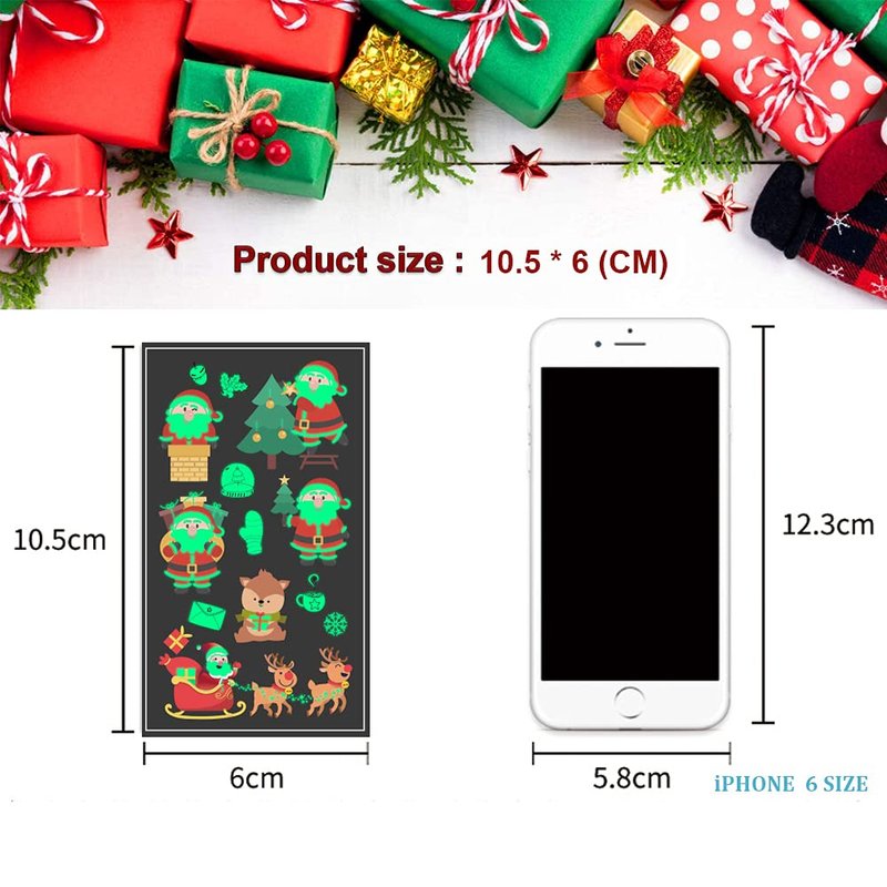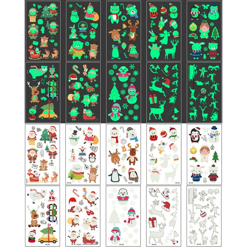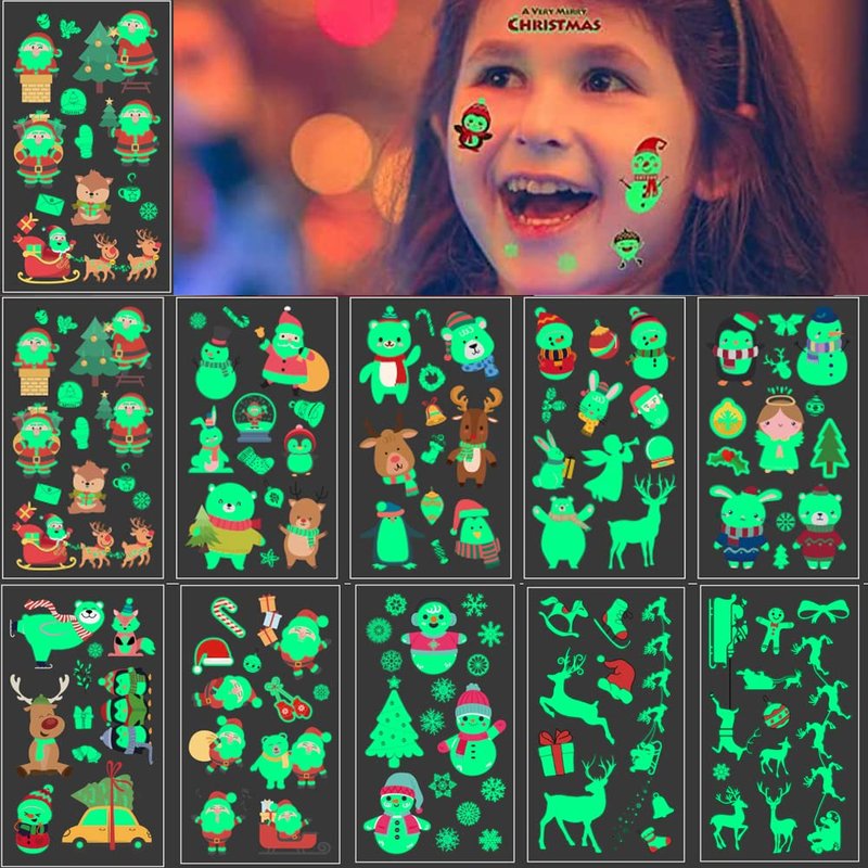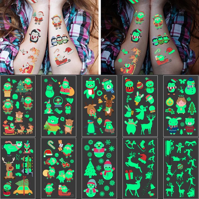- Luminous Christmas Tattoos Design - 10 Sheets 106pcs Cute Different Style Night Fluorescent Christmas Tattoos Stickers Pattern For Kids Boys Girls Women Men. Add Some Elements Of Interest To Christmas Costume. Be unique to the party and help your kids share these Christmas tattoos with their friends.You can apply them to your body or some smooth objects, for example, glass, tile, stationery, paper, stainless steel, plastic, present box, mobile phone shell, car