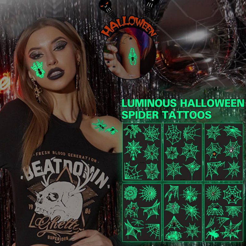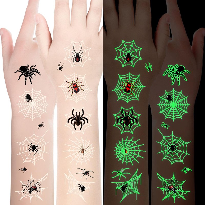 - 【 Glow-in-the-Dark Halloween Spider Tattoos for Kids】 Bring the magic of Halloween to life with our Luminous Temporary Tattoos for Kids! This set includes 10 sheets (4.33 " x 2.95") featuring 100 unique spider and spiderweb designs that glow brilliantly in the dark. Perfect for Halloween parties, these tattoos are easy to activate by simply exposing them to light for a few minutes. Watch as your little ones light up the night with these enchanting and spooky-cute designs!