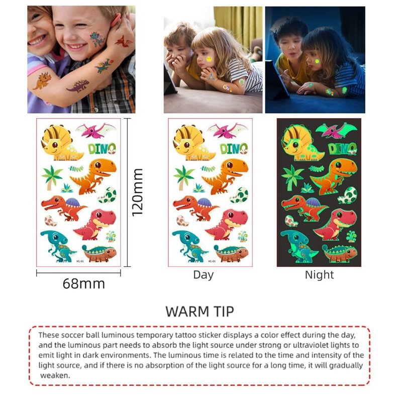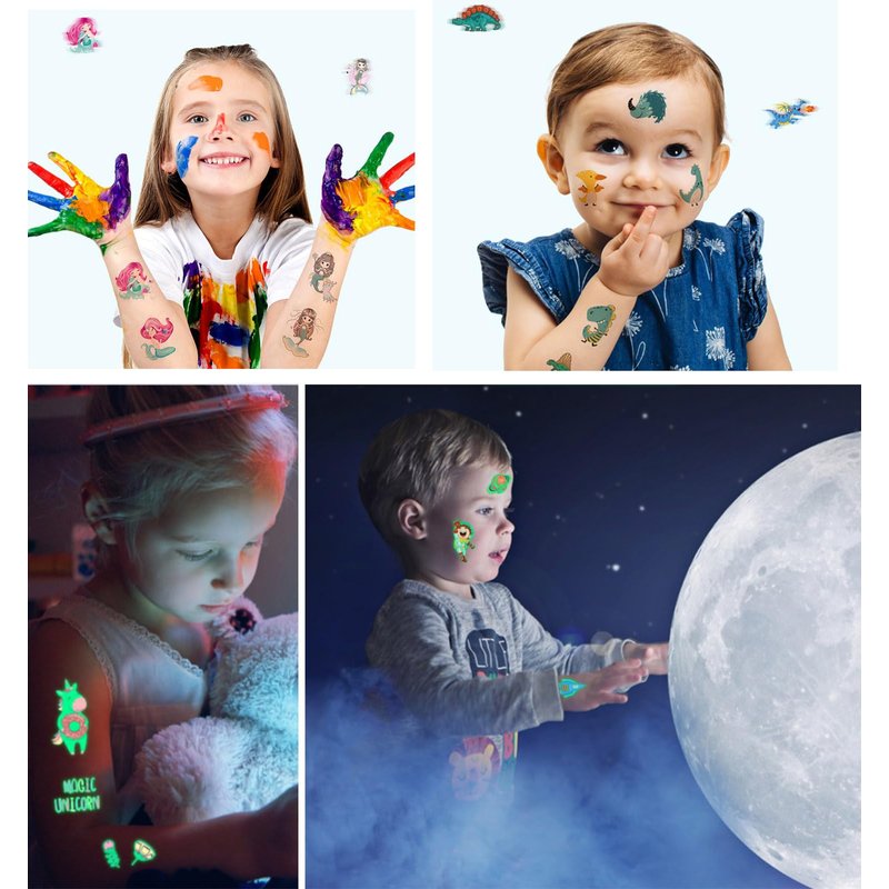 - 【409 PCS Temporary Tattoo stickers for kids 】30 sheets, in total 409 kinds temporary tattoos lovely cartoon mixed style glow in the dark tattoos, assorted sizes and shapes, no repeating patterns; 4.72×2.77 inches each sheet. They are more shiny and eye-catching!