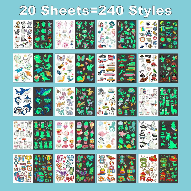 Luminous Tattoos for Kids,240 Styles Glow In The Dark Tattoos for Boys and Girls,Dinosaur Space Butterfly Pirate Mermaid Temporary Tattoo Stickers,Birthday Party Makeup Supplies 20 Sheets