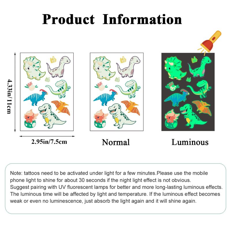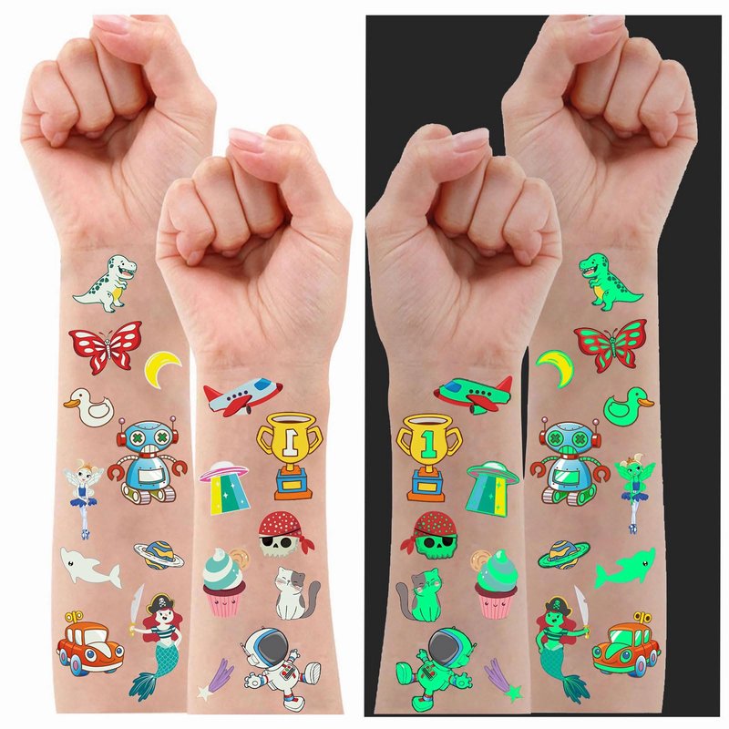 - 🎁Glow in the dark: tattoos need to be activated under light for a few minutes, if the night light effect is not obvious, please use a mobile phone light to shine for about 30 seconds. Suggest pairing with UV fluorescent lamps for better and more long-lasting luminous effects. The luminous time will be affected by light and temperature. If the luminous effect becomes weak or even no luminescence, just absorb the light again and it will shine again.