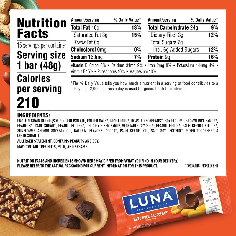 LUNA Bar - Nutz Over Chocolate Flavor - Gluten-Free - Non-GMO - 7-9g Protein - Made with Organic Oats - Low Glycemic - Whole Nutrition Snack Bars - 1.69 oz. (15 Count)