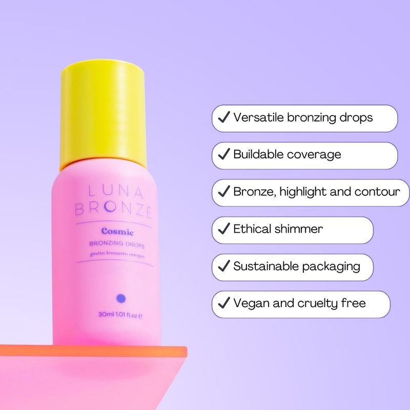 Experience a natural, sun-kissed glow with Luna Bronze Cosmic Bronzing Drops. This liquid bronzer and illuminator is enriched with sodium hyaluronate, providing a radiant, dewy finish that enhances your natural features. The buildable formula allows you to customize your desired level of warmth, from a subtle glow to a deeper, sculpted contour. With a lightweight, blendable consistency, these bronzing drops seamlessly melt into the skin, creating a flawless, natural-looking tan. Suitable for all skin tones, this versatile product can be mixed with your favorite moisturizer, foundation, or worn alone for a radiant, bronzed complexion. Achieve a luminous, healthy glow with Luna Bronze Cosmic Bronzing Drops. The 1.01 fl oz (30 ml) bottle offers a long-lasting, convenient solution for a beautiful, sun-kissed appearance.