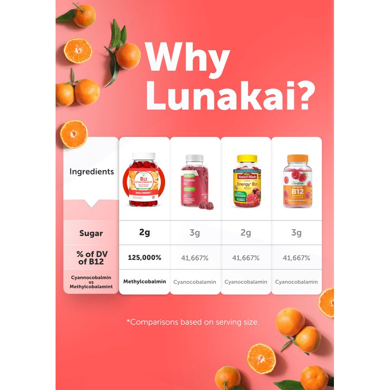 - Vegan and Non-GMO: Lunakai Vitamin B12 Gummies are made with vegan, non-GMO ingredients. We ensure the highest quality standards, making them safe and healthy vitamin B12 gummies for adults.