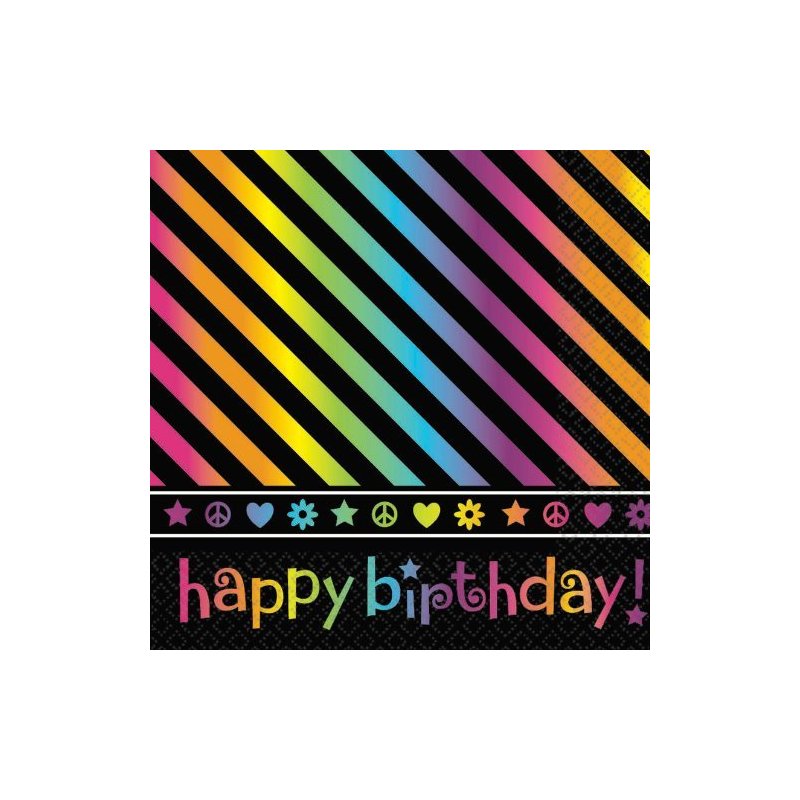 Have a bright and colorful birthday with these Neon Birthday Luncheon Napkins! Features a black napkin with a diagonal rainbow neon stripe pattern with "Happy Birthday!" printed at the bottom in rainbow neon lettering. Measures 6.5" x 6.5". Includes 16 paper napkins per package.