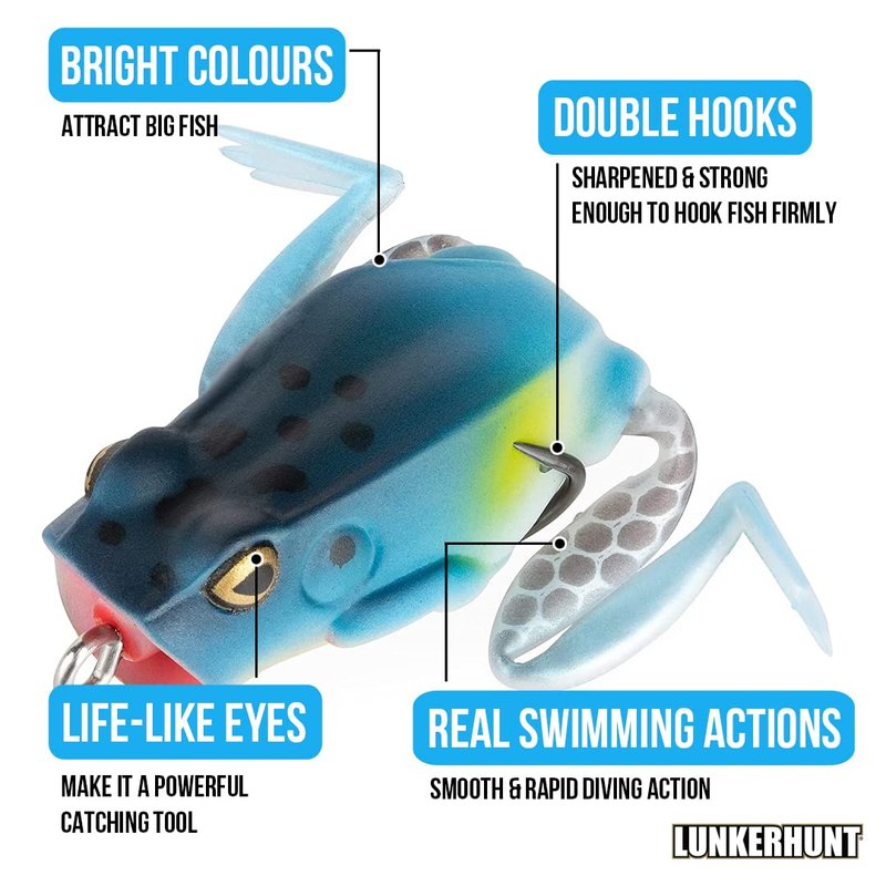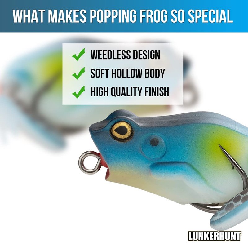 - ✅ POPPING FROG creates AMAZING TOPWATER ACTION to ATTRACT BASS FISH: The Lunkerhunt Popping Frog calls fish in by creating a surface disturbance and can be worked along edges, through grass, in pockets and on open water.
