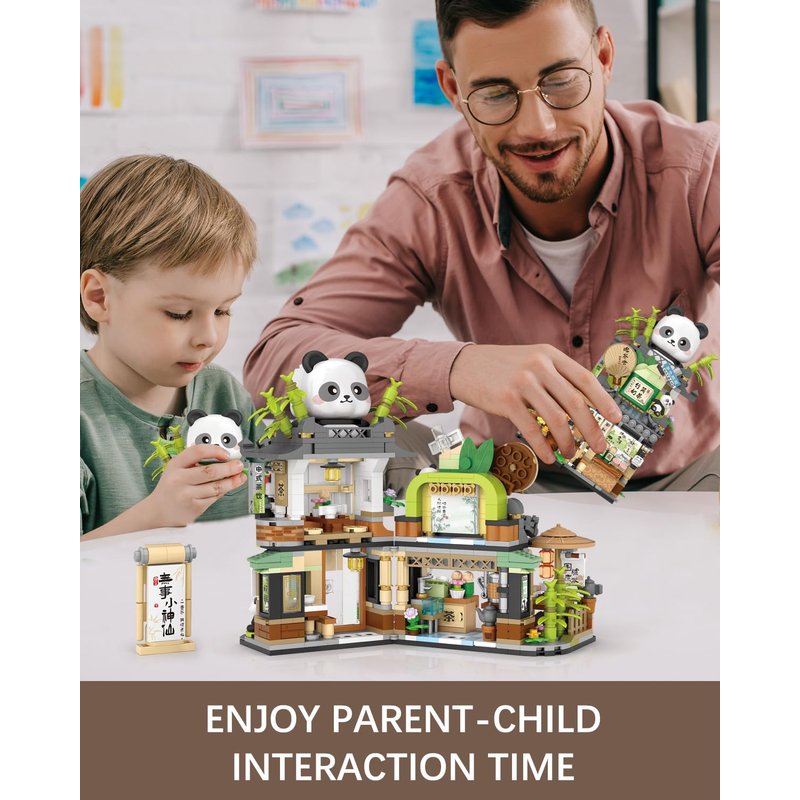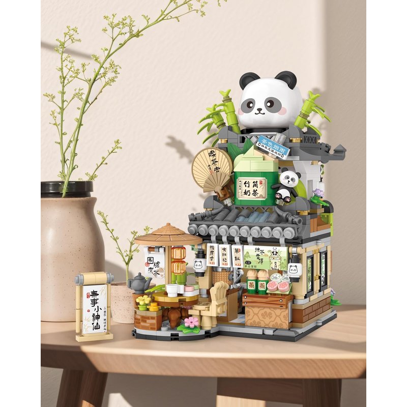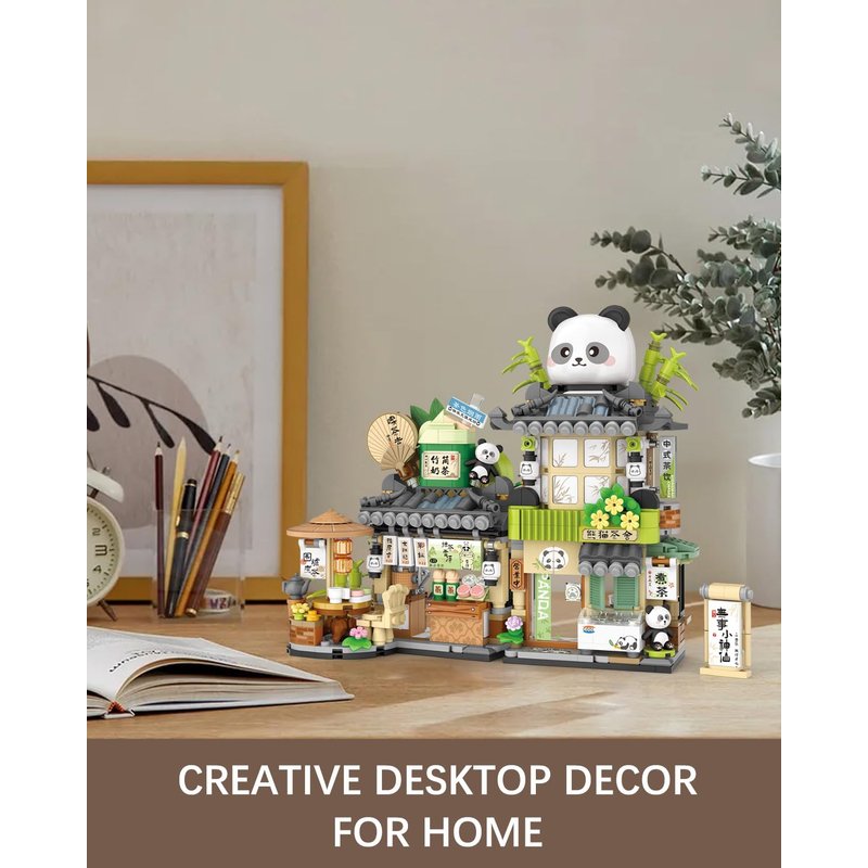 - Panda tea house street scene building, 860pcs mini blocks, made of safe ABS material, durable, lightweight, safe. The surface and edge of each block are smooth and burr free. All parts fit well and are not easy to loosen