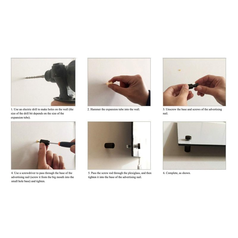 - Widely Used: Designers often use it to DIY a simple and attractive acrylic sign, install modern dry erase boards on the wall, and hang glass paintings or artworks on the wall. Wall mounting screws are a good choice for offices, supermarkets, shops, bedrooms, etc. They are not only beautiful but also practical.
