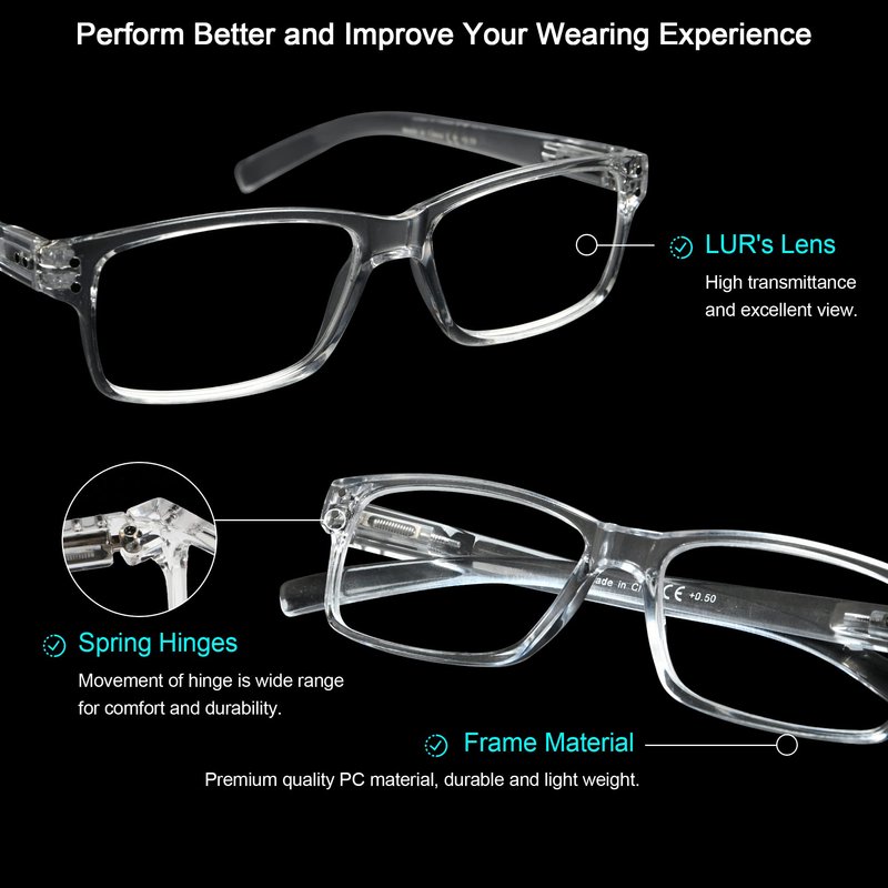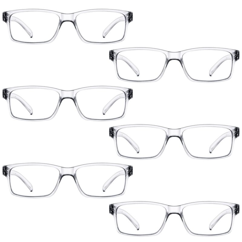 LUR READING GLASSES 6 Pack Spring Hinge Comfort Plastic Readers (Clear)