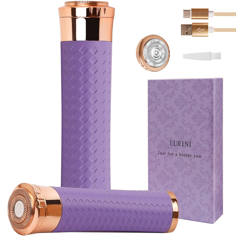 Lurini Facial Hair Remover for Women, Painless Rechargeable Hair Removal Device, Comes with 2 Replacement Heads, Portable Electric Shaver/Razor for Face, Chin, Upper Lip, arms and Peach Fuzz (Purple)