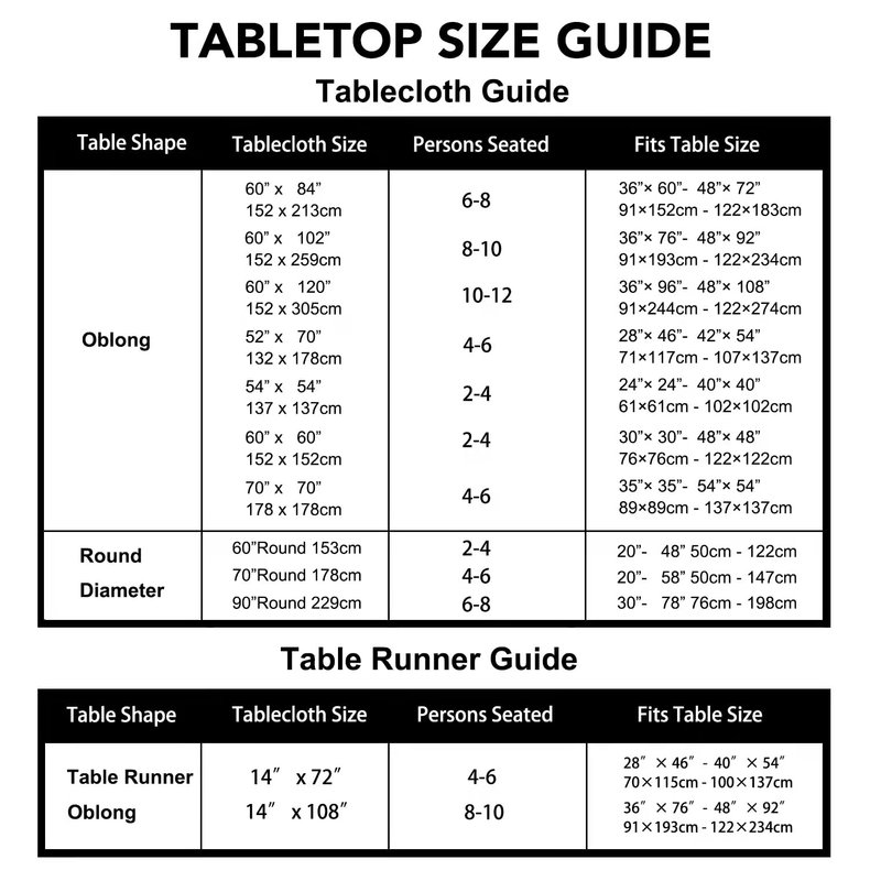 • LUSHVIDA Tablecloth Size Guide: Please measure your table size before purchase and calculate the proper size for a round or rectangular table. The available sizes are: table runner 14 x 72 inch; table runner 14 x 108 inch; Square 54x54 inch; Square 60x60 inch; Square 70x70 inch; rectangle 52 x 70 inch; rectangle 60 x 84 inch; rectangle 60 x 102 inch; rectangle 60 x 120 inch; round 60 inch; round 70 inch; round 90 inch.