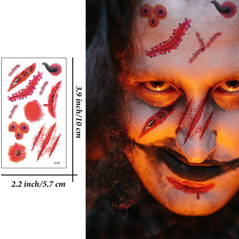 - 🖤 【Non-Toxic & Kid-Friendly】 Lusstiazz fake blood temporary tattoo stickers use non-toxic red ink, ensuring they are safe for children's skin . Whether for kids, teens, or adults, these zombie tattoos are a perfect choice!