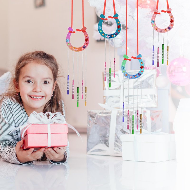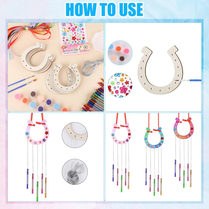 - Package Content: You will receive a DIY wooden wind chime kit for kids, including 8-hole horseshoes and 3-hole horseshoes, a total of 16 pieces of wooden horseshoes in 2 designs (8 pieces for each design); 48 pieces of wind chime pipes (4 colors, 12 per color), 2 pieces of painting brushes, 12 colors paints, 16 pieces of 1M silver wires, 16 pieces of colorful ropes, and 1 sheet of rhinestone sticker. The quantity is sufficient to meet your child's usage needs.