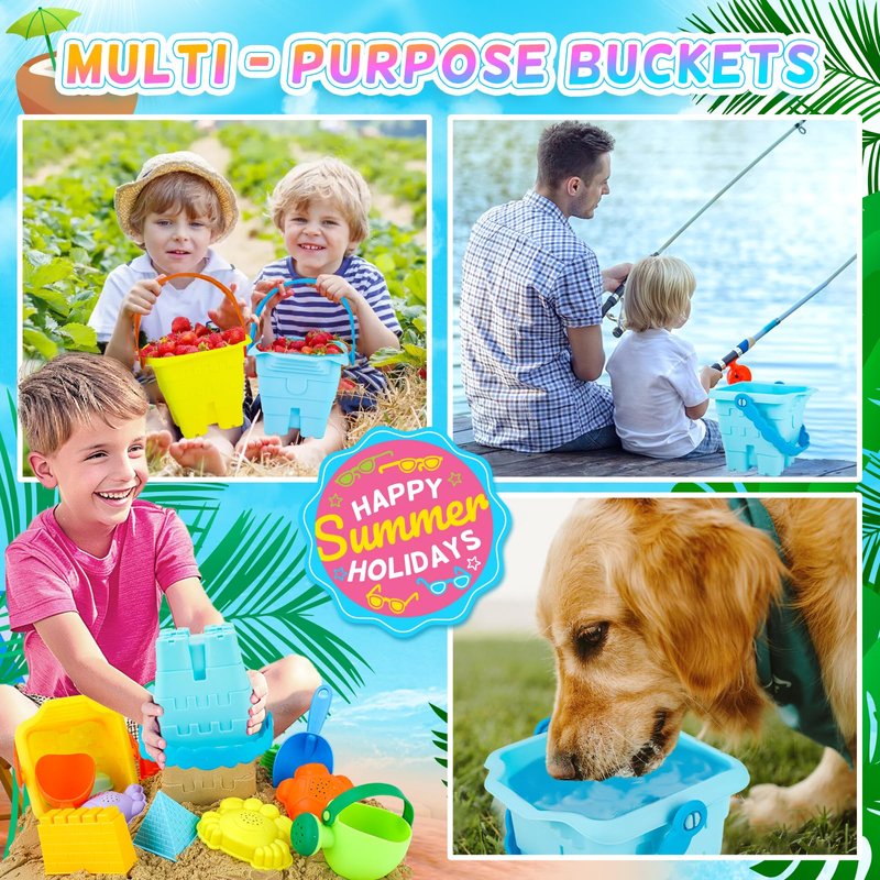 - 【Multi-Purpose Beach Bucket&Mesh Bag】 The beach buckets are made of soft and flexible TPR, easy to store and you can stuff everything in the bucket without worrying about it cracking. The toddler beach toys come with 2 reusable mesh bags for extra convenience which can filter out the water and sand quickly. 2 big pockets and an expandable bottom design make things store more easily. Not just beach toys, but great pool toys, summer toys, garden , and other outdoor activities!