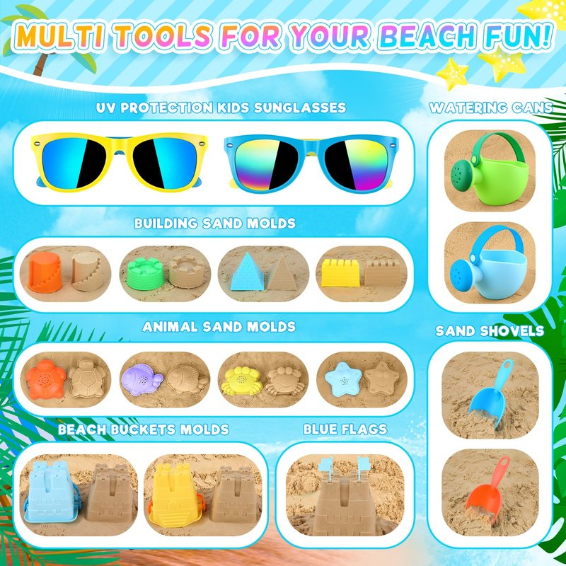 - 【Wide Variety Kids Beach Toys】When kids go to a sand beach, they can pack the UV kids sunglasses, that will protect their eyes from the sunshine and provide a comfortable beach trip for them. The sand castle toys for beach are equipped with a colorful variety of sandbox molds that keep your toddlers busy for hours at the beach which will promote kids' hands-on ability and imaginative skills at the same time.