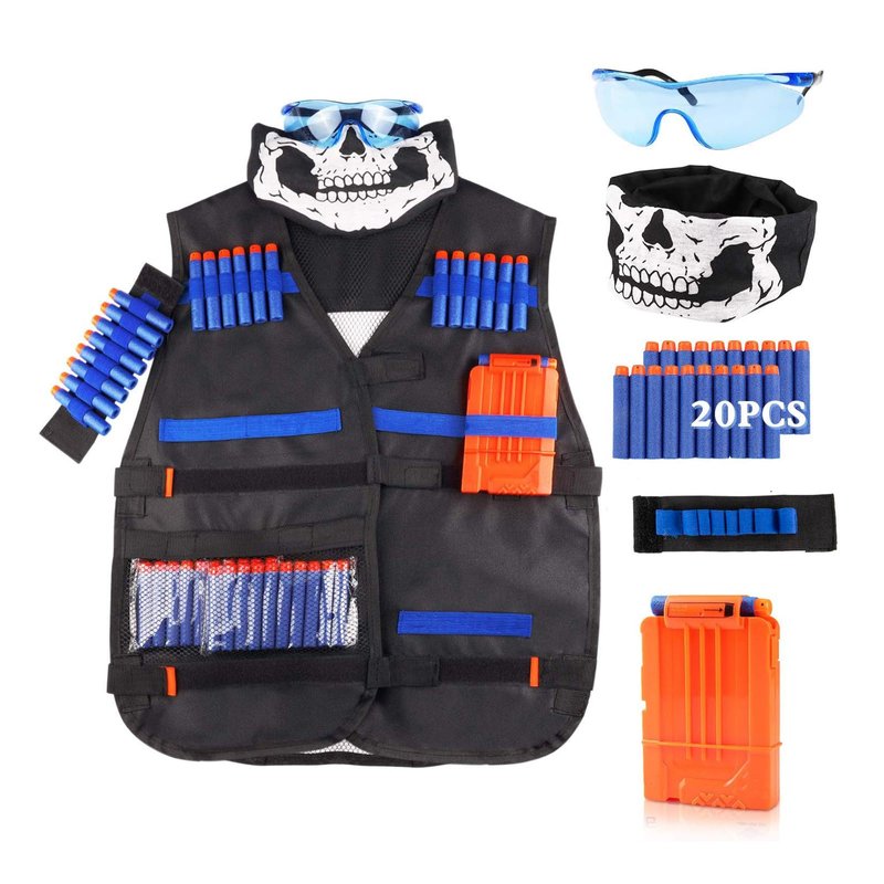- Funny Game Set: The tactical vest kit fit for nerf guns, providing kids a full preparation for any nerf battle game. Package including 1 kids tactical vest, 20 refill bullets darts, 1 quick reload clips, 1 hand wrist band, 1 protective glass and 1 tactical face mask. Designed for team games, bring kids more fun. Let the children exercise the shooting skills.