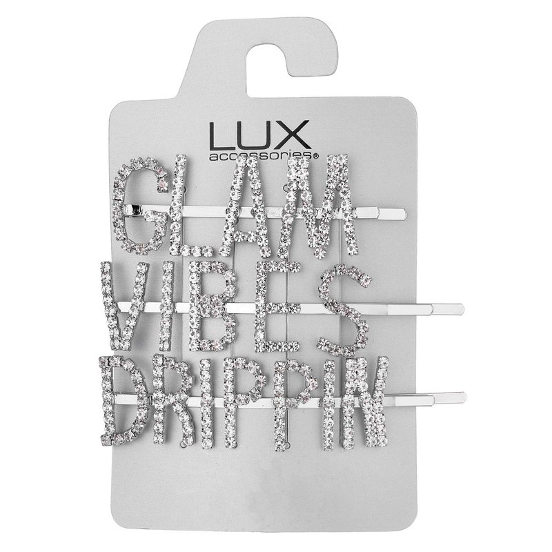 Lux Accessories GLAM VIBES DRIPPIN Word Rhinestones Silver Hair Pins Set of 3