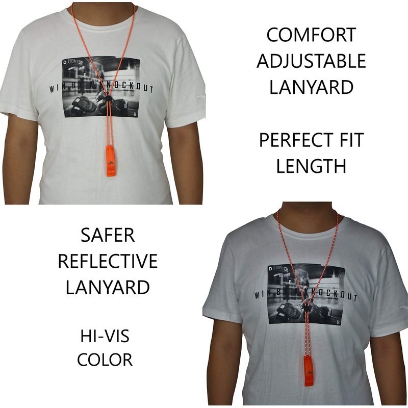 - ADJUSTABLE REFLECTIVE LANYARD and CLIP, high visibility even in the dark with slider button to adjust length around neck, long lanyards can easily loop through backpack, sailboats, camp hike gear, life jacket, kayak PFD, paddling paddle board, bike. You can also clip the whistle to your belt or shoulder straps for quick and easy use in case of emergency.