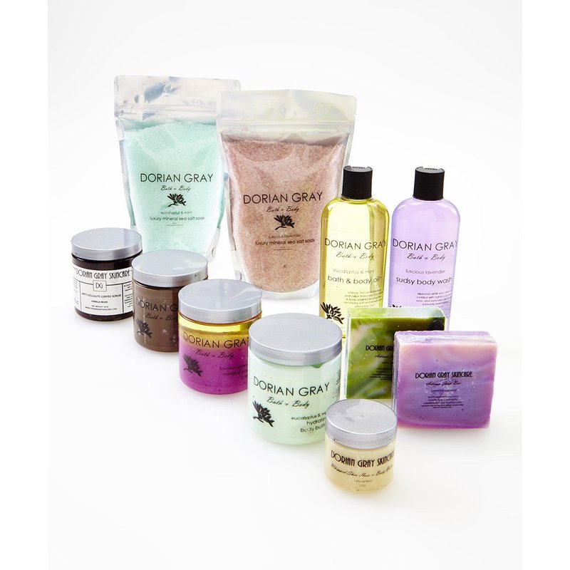Our best gift set ever! You or your loved one will receive 10 full size products plus a free gift! Your Gift Set Includes: (2) Mineral Sea Salt Soaks - 2 lbs each (1) Anti-Cellulite Coffee Scrub - 8 oz (1) Mineral Sea Salt Scrub - 8 oz (1) Body Butter - 8 oz (1) Dead Sea mud Masque - 8 oz (1) Mineral Bubble Bath - 8.oz (1) Mineral Massage and Bath Oil - 8 oz. (2) Full Size Natural Artisan Soap Bars 4 oz. each (1) Dorian Gray Whipped Shea Hair & Body Butter - 2 oz. All Beautifully contained in our signature silver gift box!