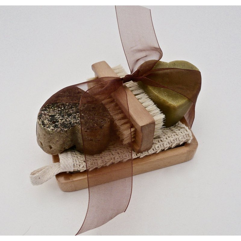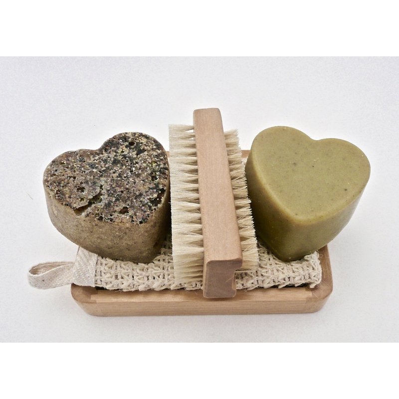Luxury Goat Milk Soap Valentines day Giftset- BOGUE Big Soap Hearts No.11 Gardener-Juniper Berry & Cornmeal to Remove Dirt & Smell No.8-Cedarwood, Lemongrass & Rosemary. Nail scrubber, cloth & tray