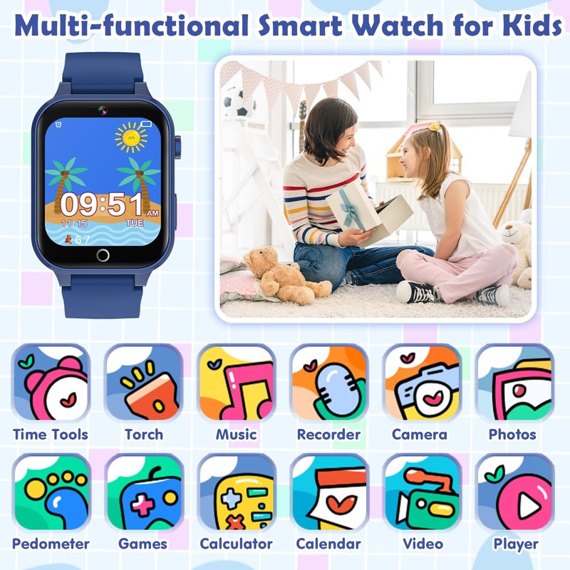 - Learning Toys for Kids: In addition to being a fun toy, Kids smart watch also has 13 educational functions and 26 different games that can help develop your child's brain and logic skills.This feature is suitable for kids aged 3-6 years old.