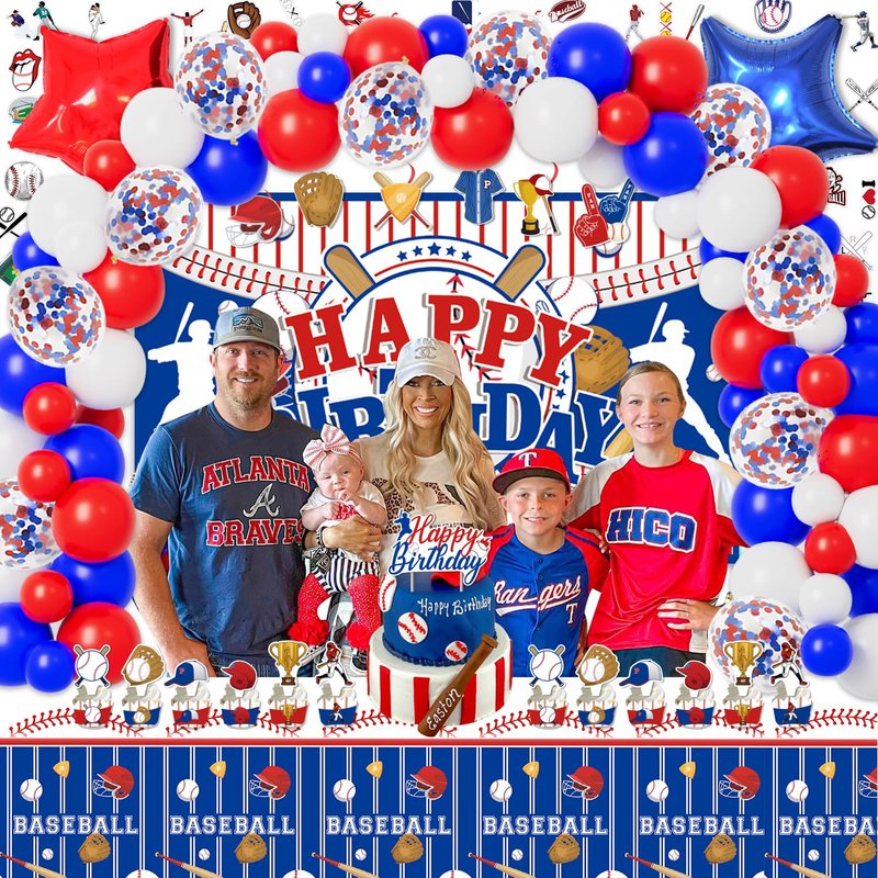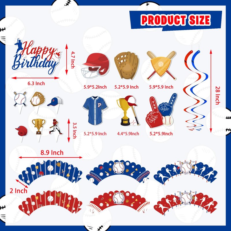 - WHAT CAN YOU GET IN PARTY: Our baseball birthday party supplies include 1 Backdrop, 24 Cupcake Topper, 24 Cupcakes Wrappers, 70 Pcs Latex Balloons (7 Styles), 8 Foil Balloons, 2 Tablecloths, 6 Party Hanging Swirls, 1 Cake Toppers, 50 Stickers.