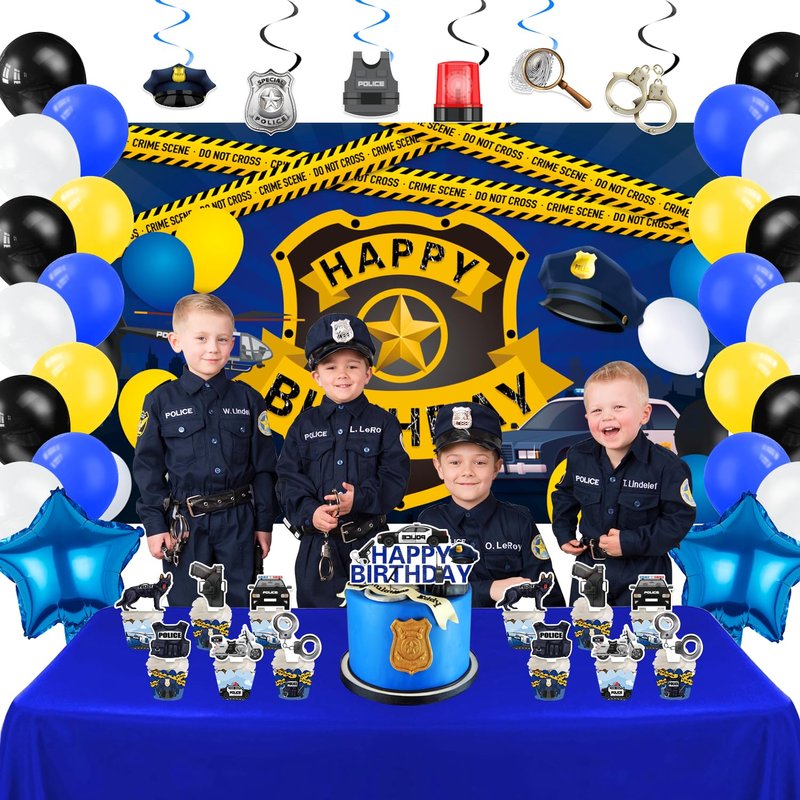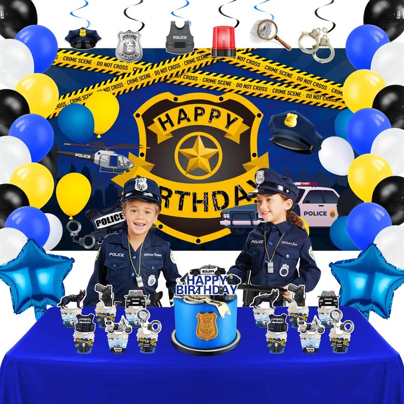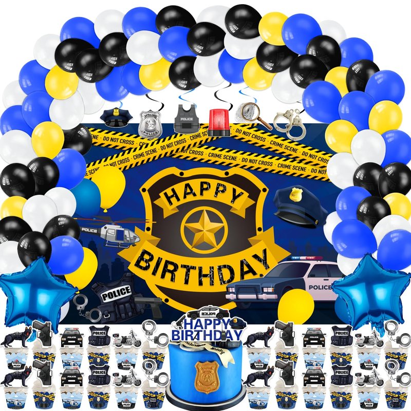 • WHAT CAN YOU GET IN PARTY: Our police birthday party supplies include 1 Backdrop, 24 Cupcake Topper, 24 Cupcakes Wrappers, 70 Pcs Latex Balloons (4 Styles), 2 Foil Balloons, 6 Hanging Swirls, 1 Cake Toppers.