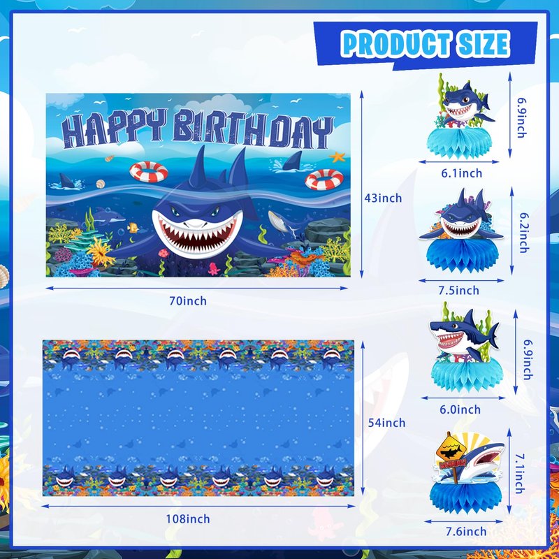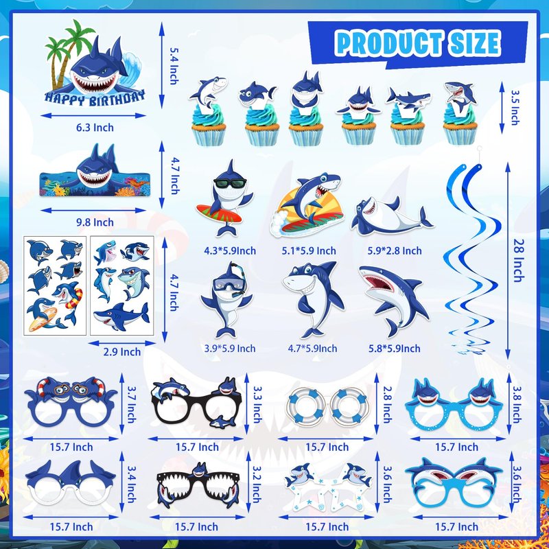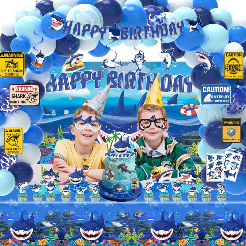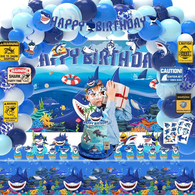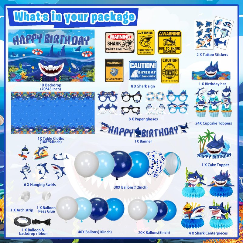 - WHAT CAN YOU GET IN PARTY: Our shark party decorations set includes Backdrop, 24 Cupcake Topper, 90 Pcs Latex Balloons (11 Styles), 4 Shark Centerpieces, 1 Banner, 1 Cake Toppers, 1 Tablecloths, 6 Hanging Swirl, 8 Shark Glasses, 6 Shark Sign, 1 Shark Hat, 2 Sheet Temporary Tattoos.