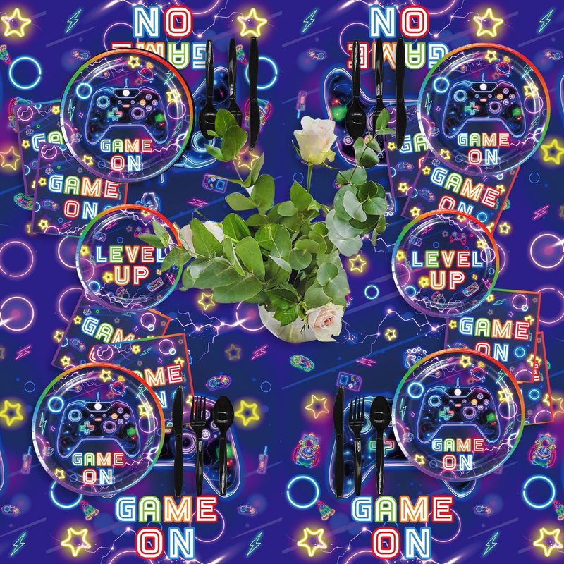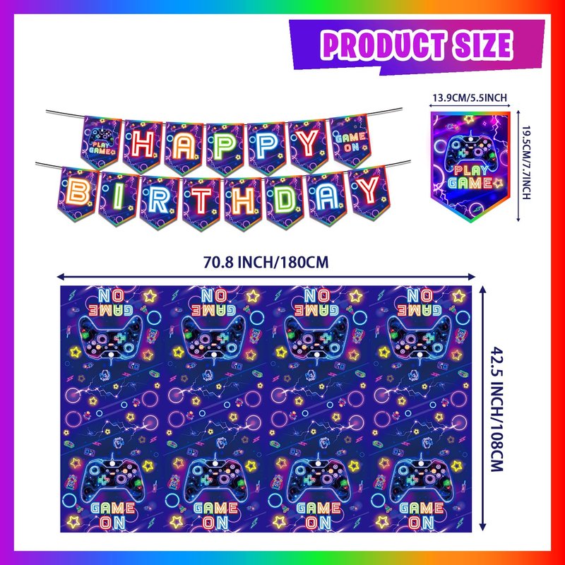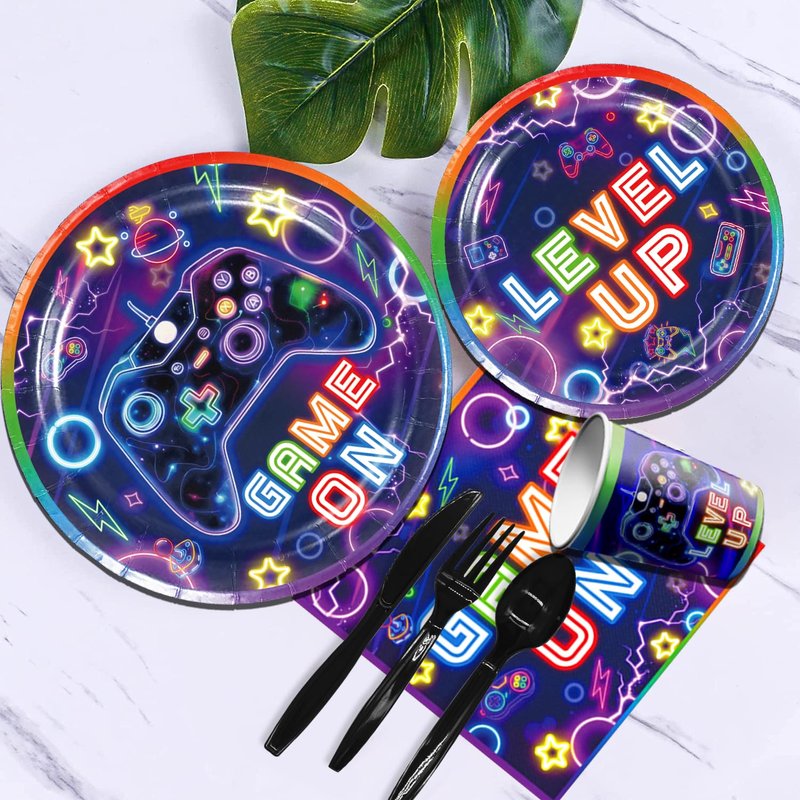 - WHAT CAN YOU GET IN PARTY: Our gamer birthday party supplies include 1 Happy Birthday Banner, 20 Knives, 20 Forks, 20 Spoons, 20 9-inch Plates, 20 7-inch Plates, 20 Straws, 20 9oz Cups, 2 Tablecloths, and 20 Paper Towels.