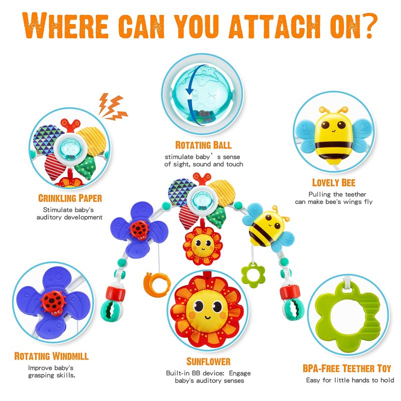 - Baby Stroller Toys with Sensory Activity Toys:Designed with vibrant colors and a playful layout, this stroller toy offers a variety of detachable toys that encourage the development of motor skills and enhance hand-eye coordination.