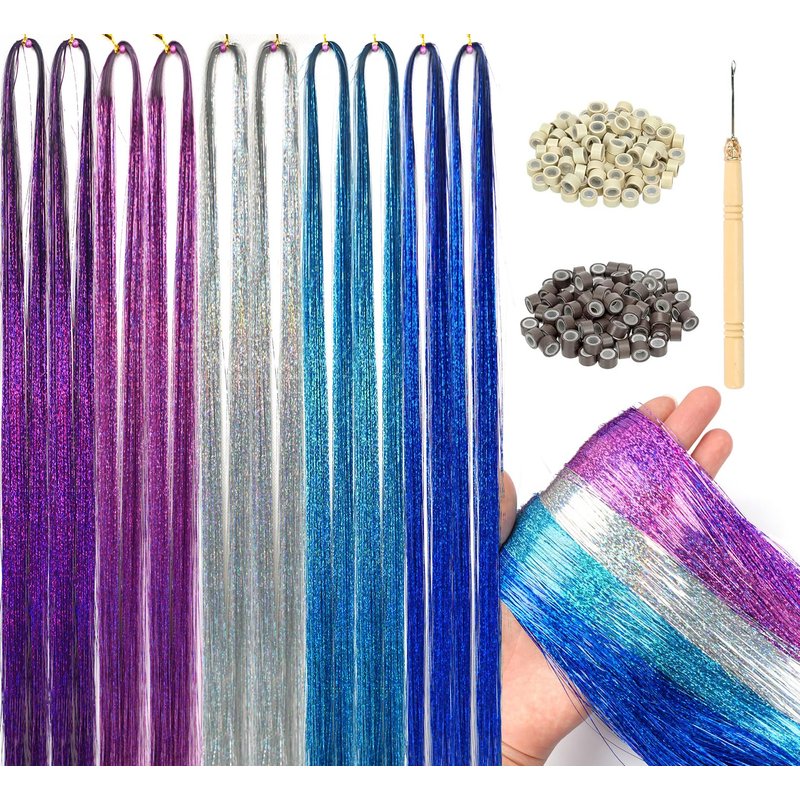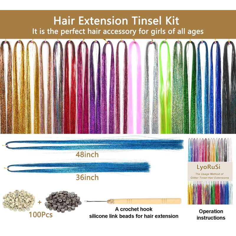 LyoRuSi Hair Tinsel Kit, Glitter Tinsel Hair Extensions with Tools (36 Inch, 5 Colors, 2200 Strands)- Fairy Hair Tinsel Heat Resistant Accessories for Women Girls Kids