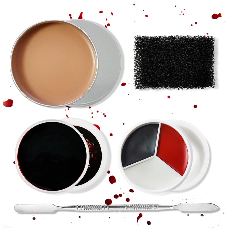 Special effects makeup kit,the kit includes scar wax,coagulated blood,red black and white face painting,stippling sponge and spatula.One kit can meet your makeup needs for creating realistic wounds.1.Realistic sfx special effects,scar wax is moldable,and a spatula can be used to create scars,facial tears,bullet holes,etc.;coagulated blood is used with a sponge to color the wound;face paint is used to design a clown image,easily achieving realistic sfx special effects.2.High quality ingredients,sfx makeup kit is made of cosmetic-grade ingredients and can be applied directly to the face and body.The makeup feels light and fits,gentle and comfortable,suitable for all skin types.3.Easy to clean,when removing makeup,first scrape off the scar wax with a spatula,then wash it with soap and warm water;face pain can be removed with makeup remover oil or makeup remover wipes
