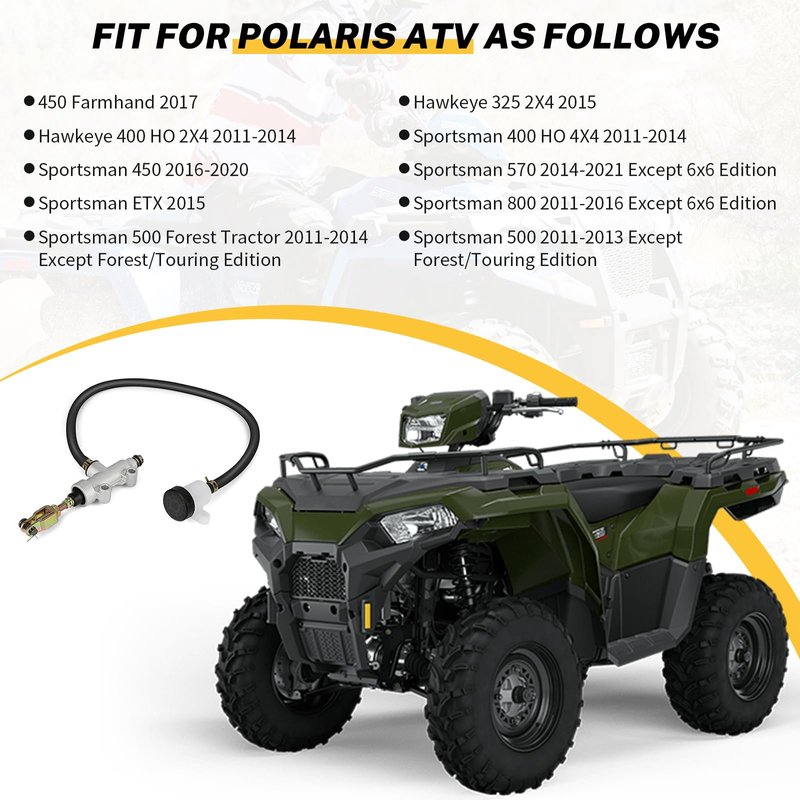 Manufacturer Part# 1911688 Replacement Part# 1912301 Package Rear Foot Brake Master Cylinder ×1 Rear Foot Brake Master Cylinder fit for the following Polaris ATV vehicles: 450 Farmhand 2017Hawkeye 325 2X4 2015Hawkeye 400 HO 2X4 2011-2014Sportsman 400 HO 4X4 2011-2014Sportsman 450 2016-2020Sportsman 500 2011-2013 Except Forest/Touring EditionSportsman 500 Forest Tractor 2011-2014 Except Forest/Touring EditionSportsman 570 2014-2021 Except 6x6 EditionSportsman 800 2011-2016 Except 6x6 EditionSportsman ETX 2015