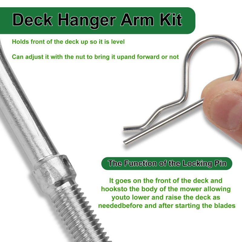 - The Deck Hanger Arm Kit includes new arms and required mounting hardware, and is constructed of 4130 steel and galvanized to resist rust, yet durable enough to increase the useful life of the deck hanger arms.
