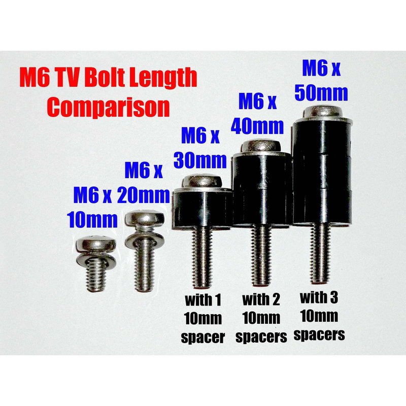 X Long (40mm) M6 TV Wall Mount Bracket to TV Bolts or Screws Installation Fastener Kit With 20mm Long Spacers For VESA 200x200 TVs Grade 18-8 Stainless Steel TVs 30" thru 40” are attached to wall mount brackets with our standard 20mm long M6 bolts. However, some installation jobs use spacers to move the TV away from the wall for easier wire management and better circulation. This kit includes 40mm long bolts and 20mm (about 13/16”) long plastic spacers This packet contains enough hardware to mount one VESA 200 x 200 TV. This kit includes: (4) stainless steel, Phillips Head M6 x 40mm long bolts (8) plastic 10mm long spacers (4) stainless steel, 8mm flat washers One payment of $9.00 buys 4 bolts, 8 spacers and 4 washers