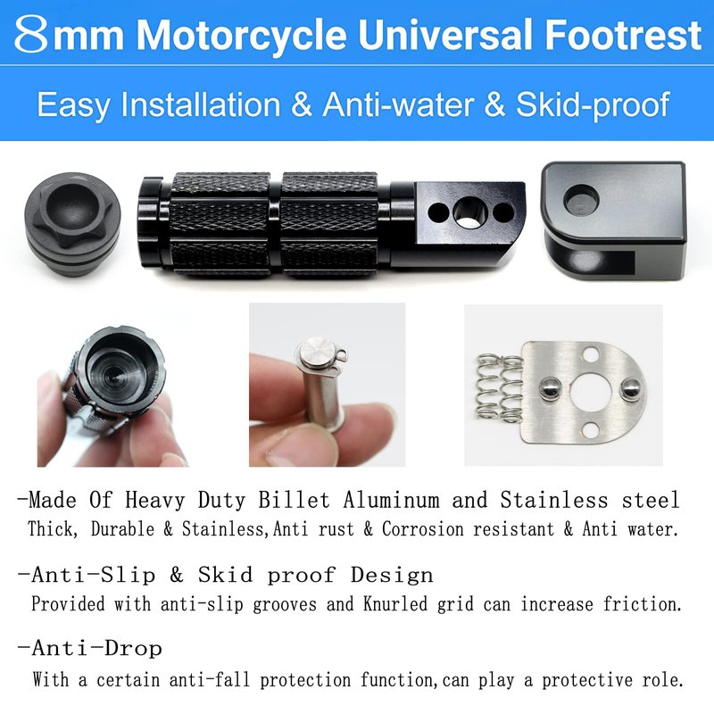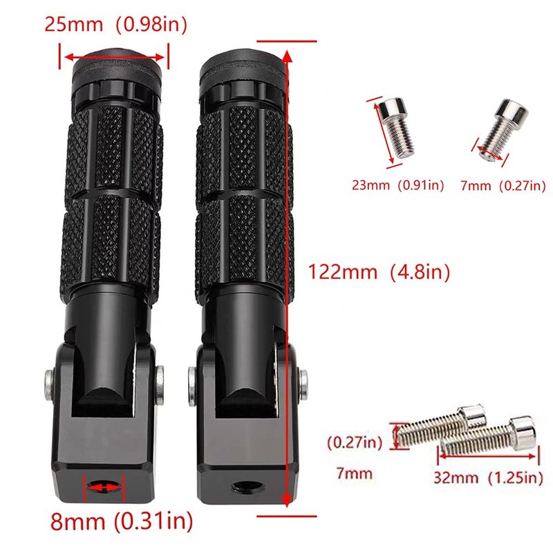 Specifications : The support rod can be folded 90 degrees fixed, Can stay folded, this can be fixed in an L Shape. Install Bolt Size : M8 (8mm) 2Sets Thread Length : 23mm(0.91 inches) / 32mm(1.25 inches) Installationlocation : Rear Set passengers Footrest Size : 4.8inchx 0.98inch x0.98inch Item Weight : 300g Material : High Quality Aluminum Alloy, CNC Machined, Plating. Knurled Anti-slip design offer great safety and comfort for passengers.Safe for cycling and reduce foot weariness. Applicable Models : Universal For Motorcycle, Bicycle, Bike, Electric Car, ATVs, UTVs, Go Karts, Quads, Scooters which Use 8mm Install Bolts Fit for BMW, Honda, Kawasaki, Ducati, Suzuki, Yamaha, Aprilia, Triumph, Aprilia etc. (Please Ensure This Part Fits For Your Motorcycle/Bicycle Before Ordering) Easy to Install : This product includes 2Sets mounting screws that are easy to install and quick to install, generally used for 8MM installation, which is convenient for operation and does not require complicated tools. Package Includes : 1 x Footrests Set(Left Right Sides) 4 x mounting screws