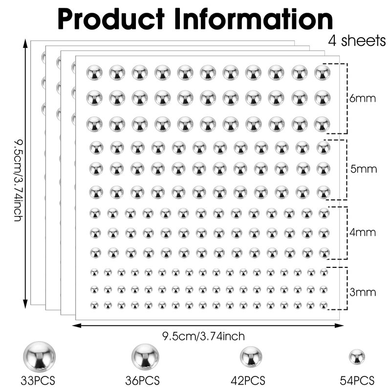 Product size (inch): Each sheet is 3.74x3.74inch, 4 sheets in total. 54 pieces of 0.12inch, 42 pieces of 0.16inch, 36 pieces of 0.2inch, 33 pieces of 0.24inch, 165 pieces per sheet<br>