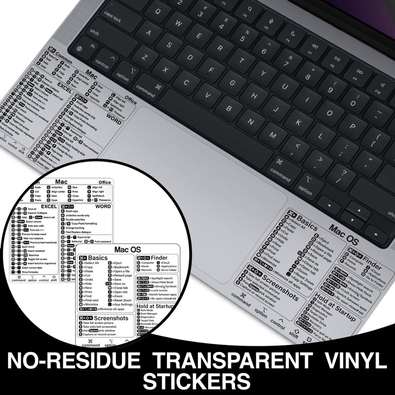- 【High Quality】This Mac Shortcut Keyboard Sticker is made of high quality vinyl, scratch-resistant and highly water-resistant. No residual adhesive, easy to stick on the pc.