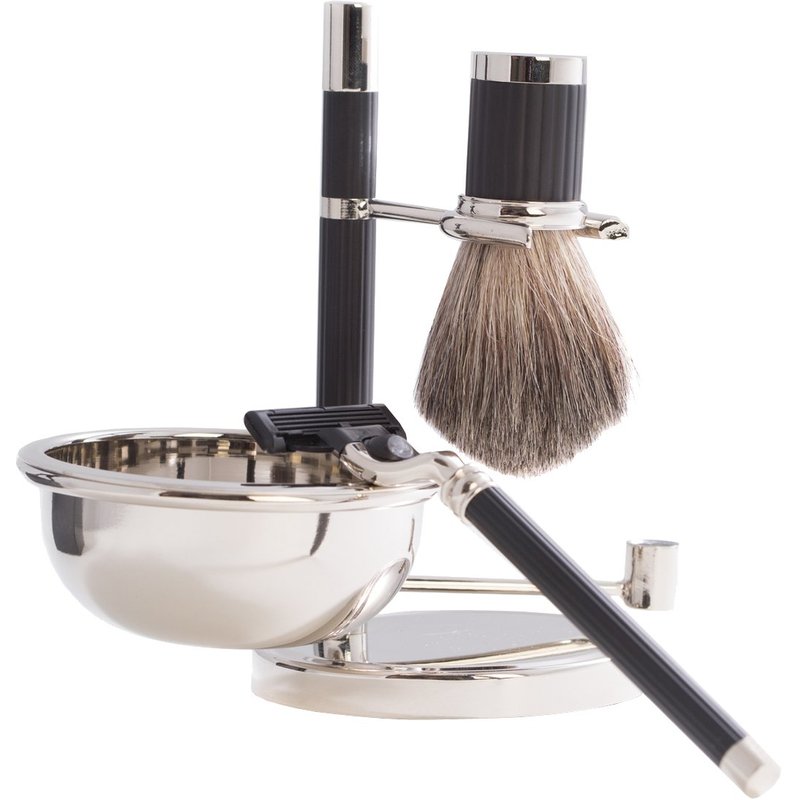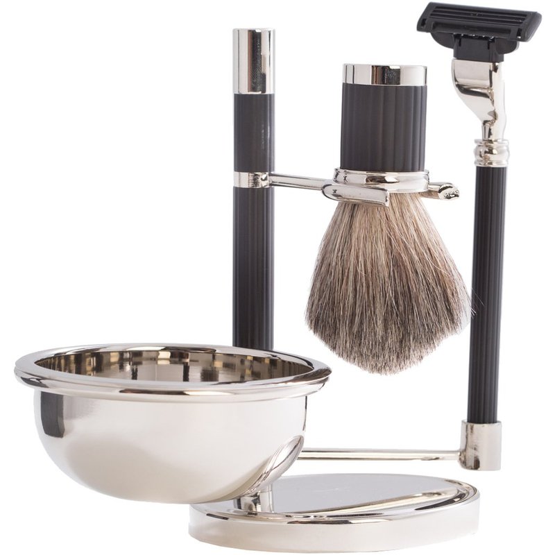 "Mach 3" Razor & Pure Badger Brush with Soap Dish on Chrome Black Stand.