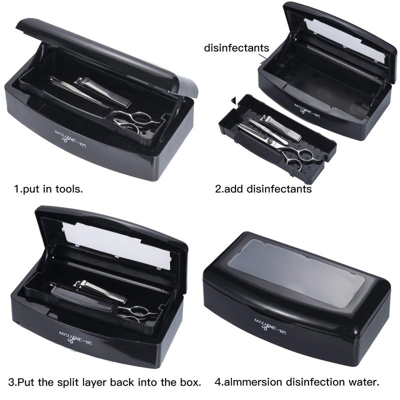- Instructions:Opening the lid, the tray will be lifted & put the tools on the tray. Pour disinfectant & the tools that need to disinfect into the sterilizing box.then close the lid, the tools will be soaked & disinfected. Finally, take out it