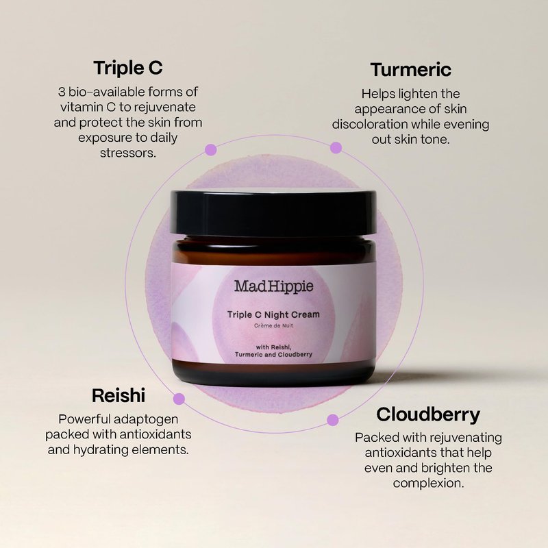 Experience the natural solution to beautiful skin by unlocking the natural age-defying power of Vitamin C. This beautiful skin care set includes Mad Hippie's Triple C Night Cream along with our award-winning Vitamin C Serum, the best-selling natural skin care product in the U.S. (SPINS 2021) and rated Super Safe (1) by the Environmental Working Group.