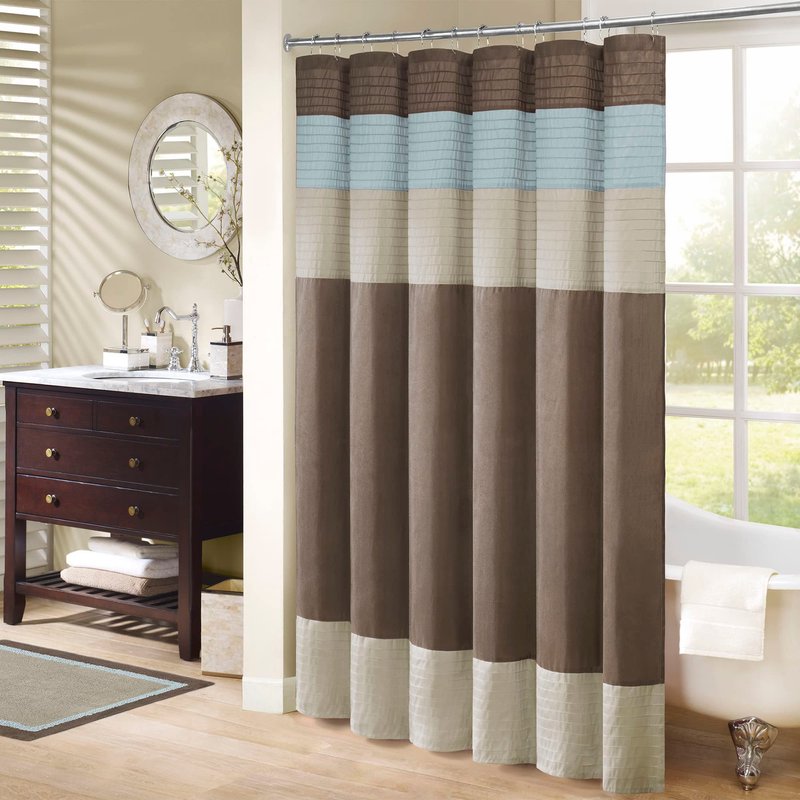 Madison Park Amherst Bathroom Shower Curtain Faux Silk Pieced Striped Modern Microfiber Bath Curtains, 72x72" Inches, Blue