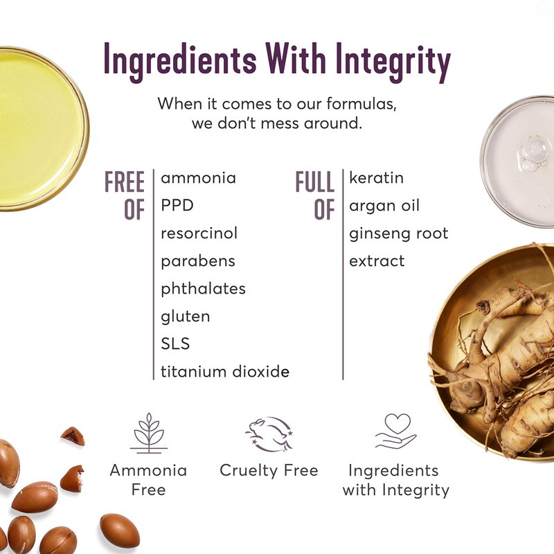 - NO HARSH INGREDIENTS: 100% ammonia-free, PPD-free, resorcinol-free, paraben-free, phthalates-free, sulfate-free, gluten-free, titanium dioxide-free and cruelty-free.