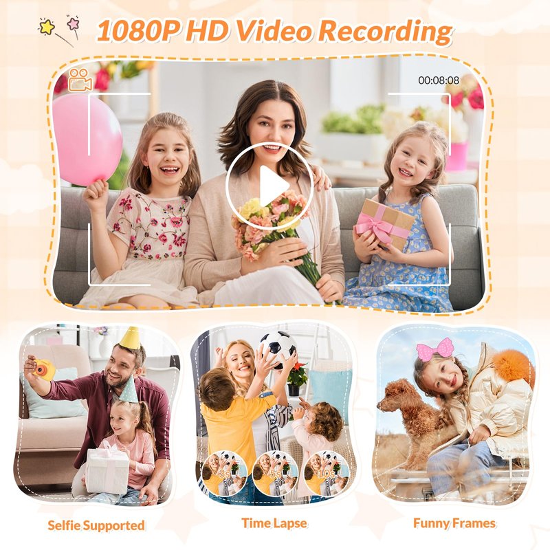 - 【Kids Video Camera】Your babies can record 1080P HD VIDEO by this camera. Plus, this camera uses high quality non-toxic soft plastic,more safe and comfortable for children’s skin.