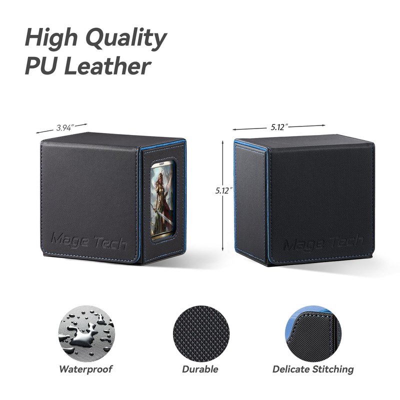 Mage Tech Card Deck Box for MTG Commander - Patented Design, Commander Display, Fits 100 Double-Sleeved Cards, 35pt Card Brick & Dice Tray - Black/Blue