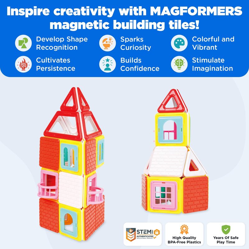 - The original and authentic Magformers. Build with 18 squares, 8 triangles, 2 trapezoids. Add walls, windows balconies to your design and follow along with the included idea sheet.
