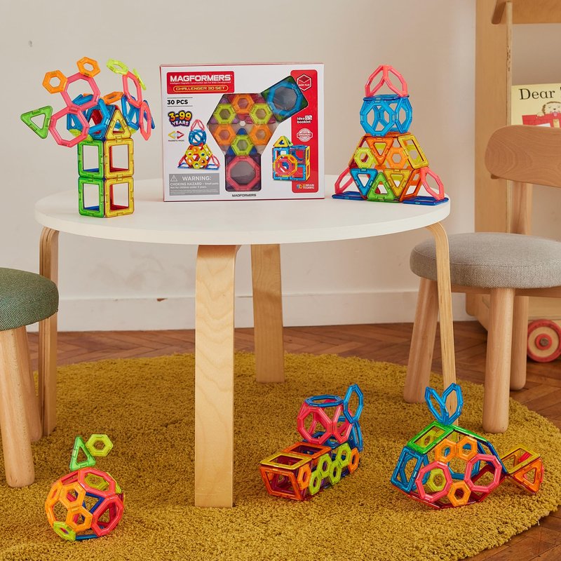 Magformers Magnetic Tiles are magnetic construction toy sets that let children click together colorful geometric shapes to build endless creations. Elevate your building experience with the Challenger 30-Piece Set! The innovative mini octagon and mini hexagon pieces connect on alternate sides, inspiring unconventional thinking and stimulating creativity. Expand your constructions and craft intricate models using 4 triangles, 10 squares, 8 mini hexagons, and 8 mini octagons—imagine building a ukulele or even a dinosaur! Unlock new levels of imagination with this versatile set. The always-attracting magnetic blocks ensure pieces click together securely for durable structures and can be neatly stacked for storage. Suitable for ages 3+, Magformers aids skill development as STEM.org authenticates it for seamlessly integrating into STEM education at home or at school. These stem magnetic tiles are evaluated to align with science/math standards and 21st-century skills. Magformers magnetic building tiles promote critical thinking, creativity, problem-solving, and collaboration. This set engages young minds through sensory stimulation and kinesthetic learning.