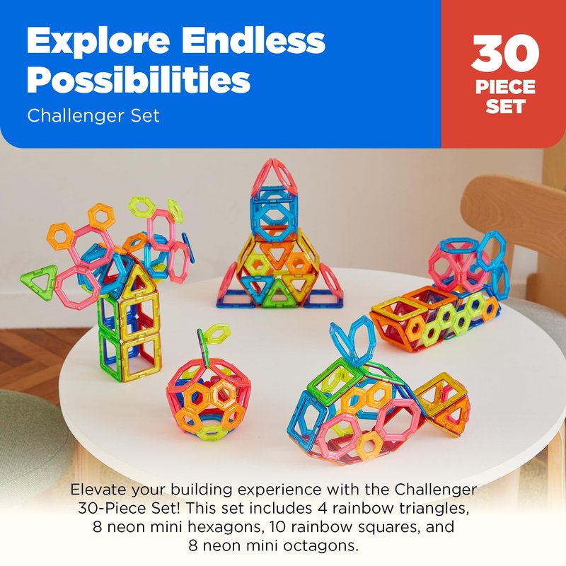 - ENDLESS BUILDING ADVENTURES: This 30-piece tile magnets for kids Challenger set includes 4 rainbow-colored triangles, 8 neon-colored mini hexagons, 10 rainbow-colored squares, and 8 neon-colored mini octagons. It is ideal for ages 3 years and up.